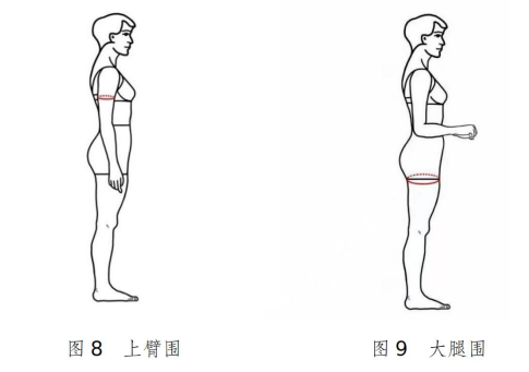 考生直立,手臂自然下垂,测量人员测量肩点和肘部中间处的水平围长(见图8)。