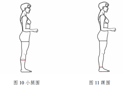 考生直立,两脚分开与肩同宽,腿部放松。测量人员测量小腿腿肚最粗处的水平围长(见图10)。